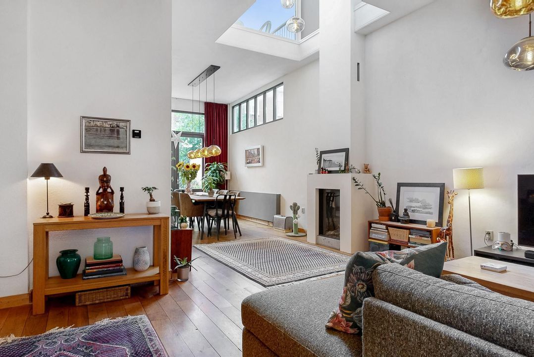 De L-vormige woon-/eetkamer is een verrassend licht en luchtig geheel, dankzij de hoge vide en de grote ramen in de zijgevel die de zon prachtig binnenlaten. De open keuken is modern uitgerust met diverse inbouwapparatuur en via de openslaande deuren stap je zo de zonnige achtertuin in.